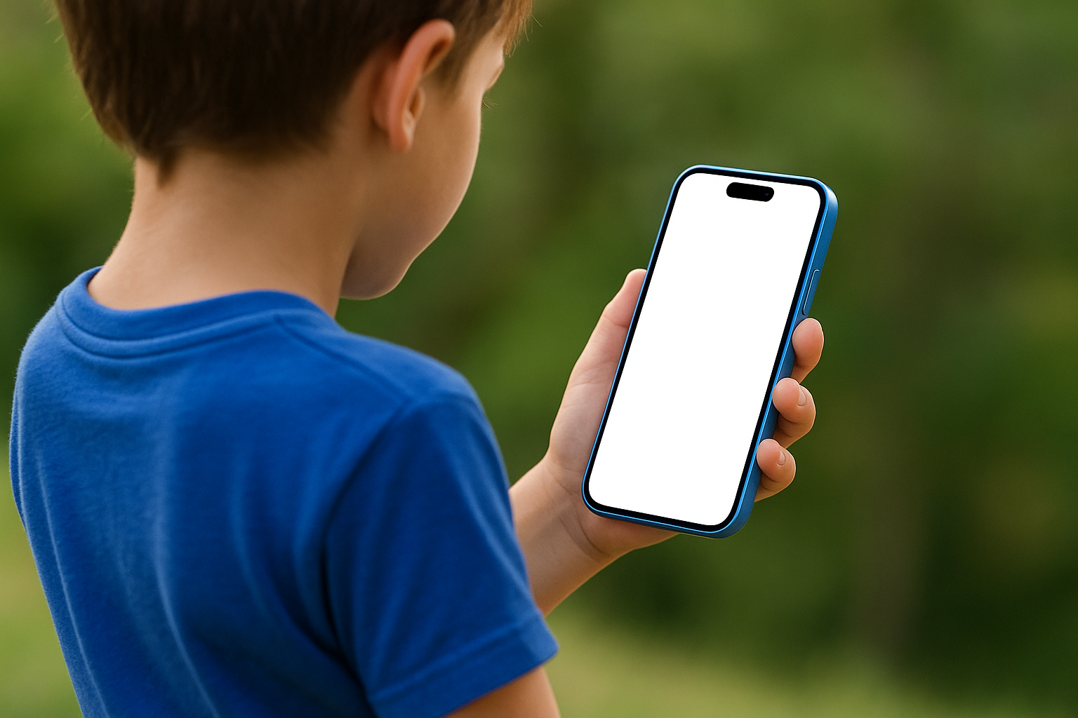 A young boy, around 10 years old, is holding a blue gaming phone with a blank screen. The shot captures him from behind, focusing on the phone and his blue shirt against a blurred green background.
