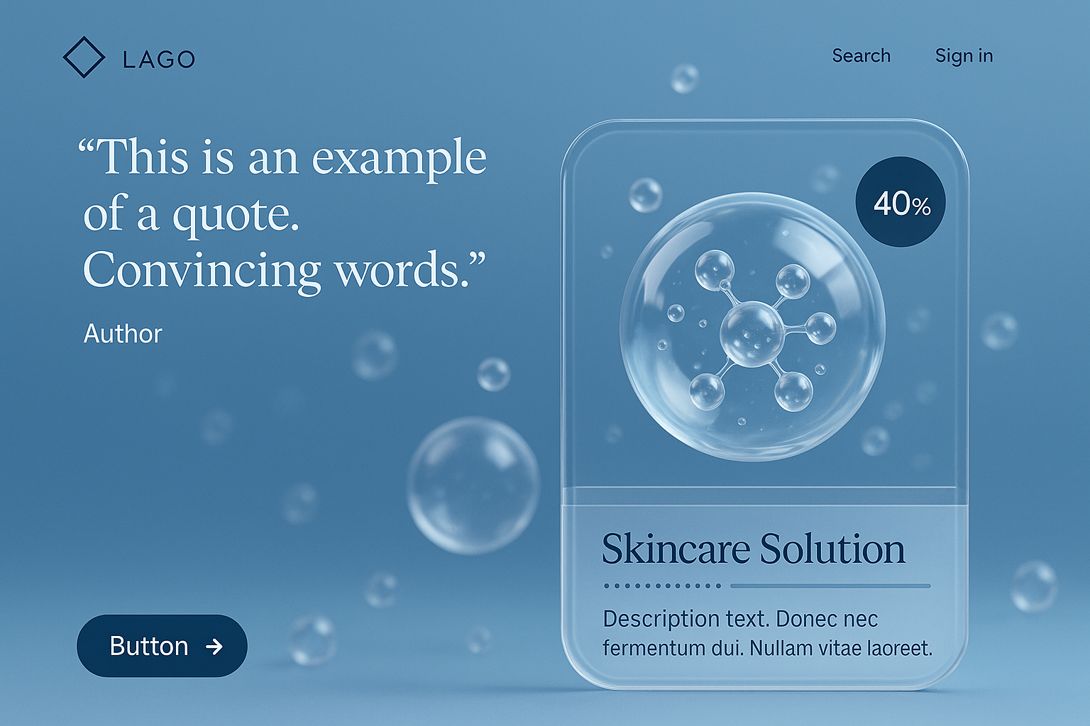 A modern landing page design showcasing transparent liquid collagen bubbles. Features a quote box, action button, and skincare product information.