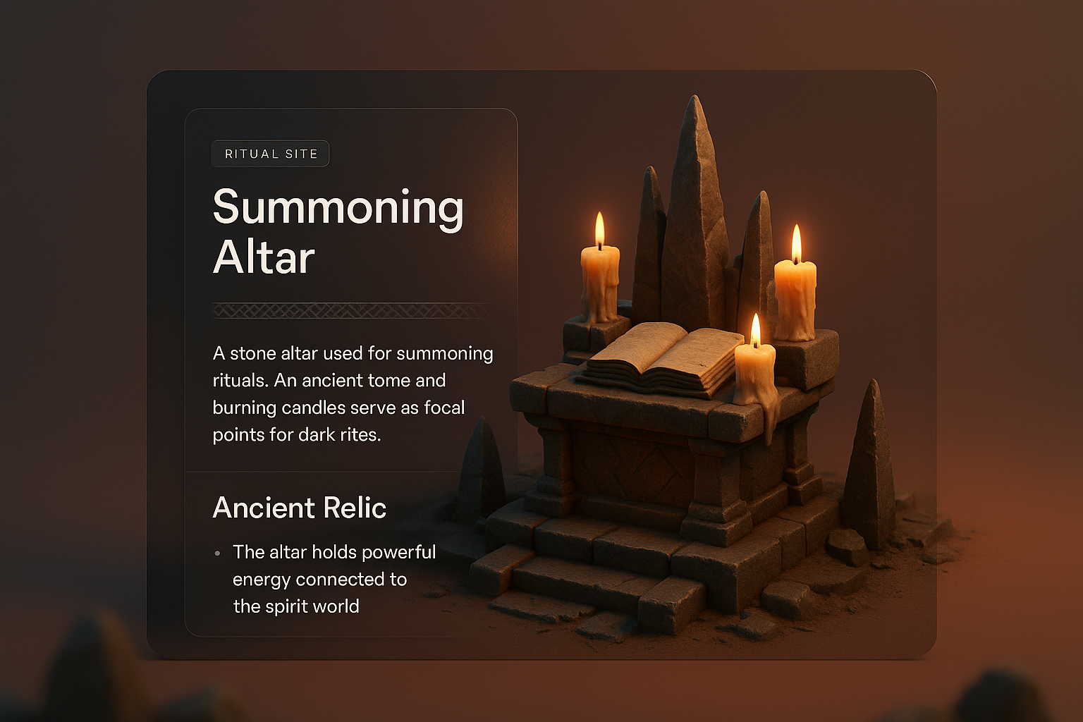 /Collection: /by davooda/Type: PNG/A captivating 3D illustration of a summoning altar featuring an ancient tome and burning candles, set against a gradient background. The design incorporates elegant text blocks and layered visuals.