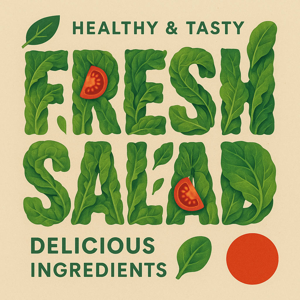 Colorful graphic promoting fresh salad featuring leafy greens and tomatoes creatively integrated into the typography. Ideal for food marketing and health-related campaigns.