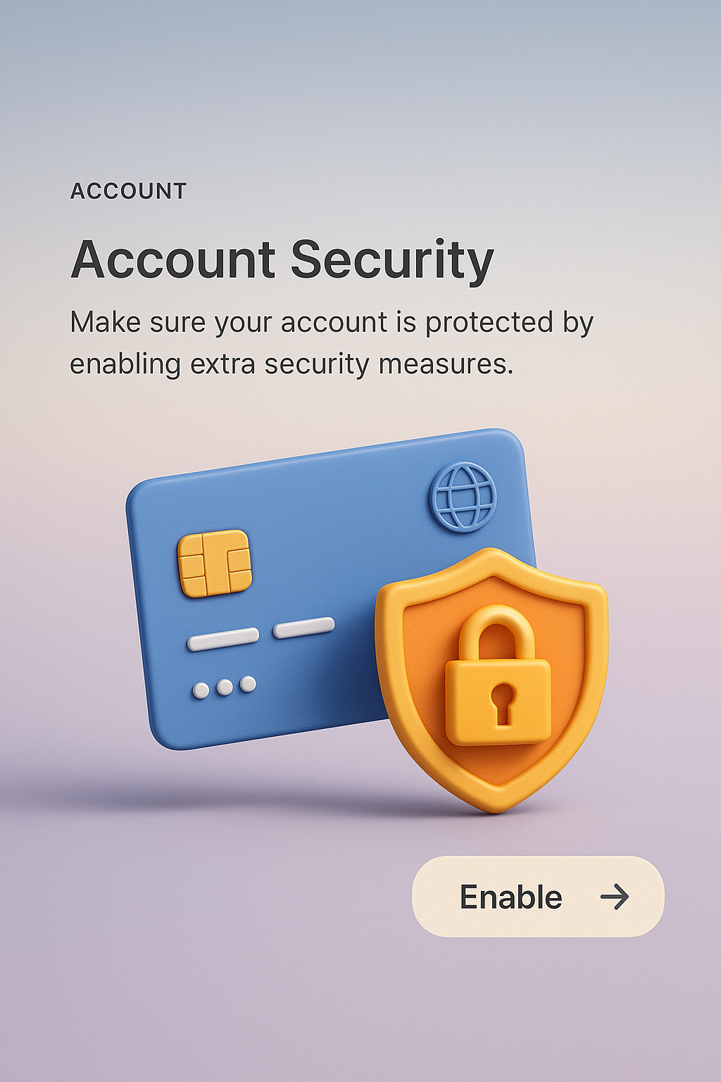 /Collection: /by davooda/Type: PNG/A 3D illustration featuring a credit card and a shield with a padlock symbol, emphasizing account security. The design has a smooth gradient background, enhancing the visual appeal.