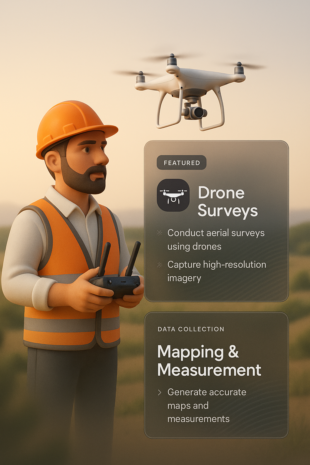 /Collection: /by davooda/Type: PNG/A 3D illustration of a drone operator in a safety helmet, controlling a drone. The image features a soft gradient background with informative text blocks highlighting drone surveys and mapping.