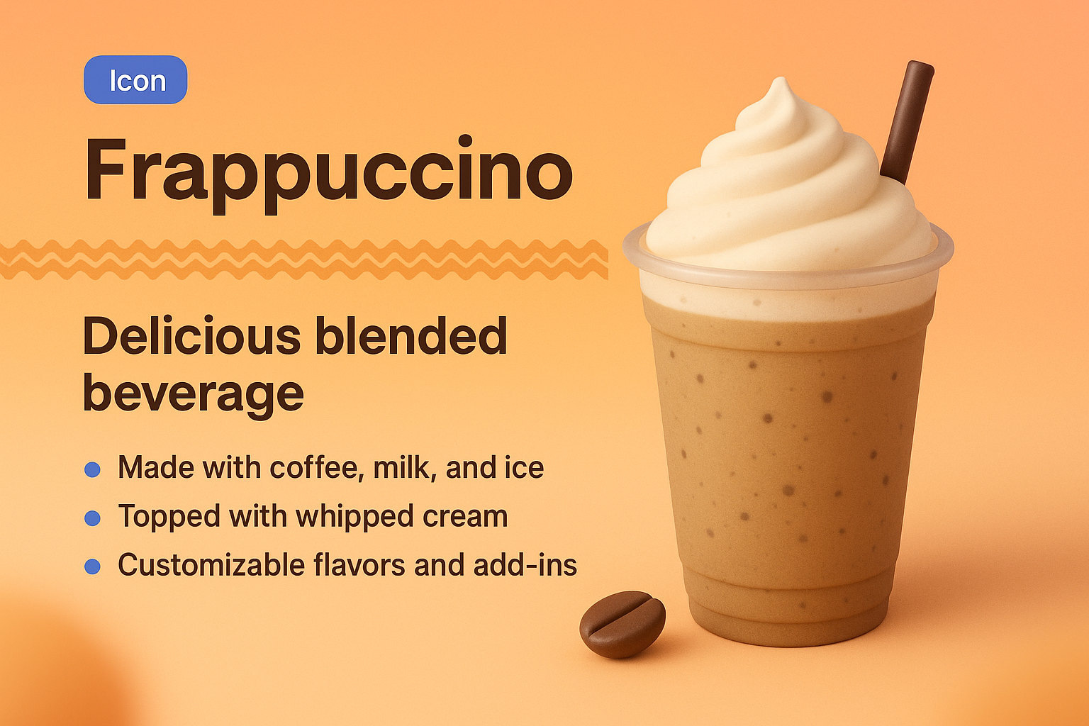 /Collection: /by davooda/Type: PNG/A visually appealing landing page design featuring a 3D illustration of a frappuccino. The layout includes a gradient background, vibrant text blocks, and an engaging feature list.