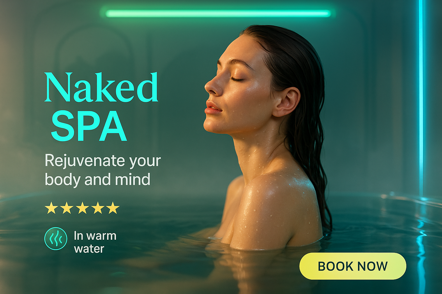 /Collection: /by davooda/Type: PNG/A visually captivating spa promotion banner featuring a serene image of a woman in a warm water setting, designed to attract clients seeking relaxation and rejuvenation.