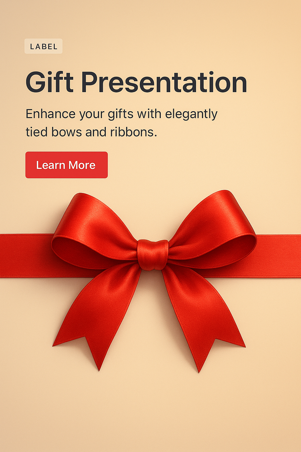 A beautifully designed red bow is featured prominently against a smooth gradient background. Accompanying text invites viewers to enhance their gift presentations with elegant ribbons.