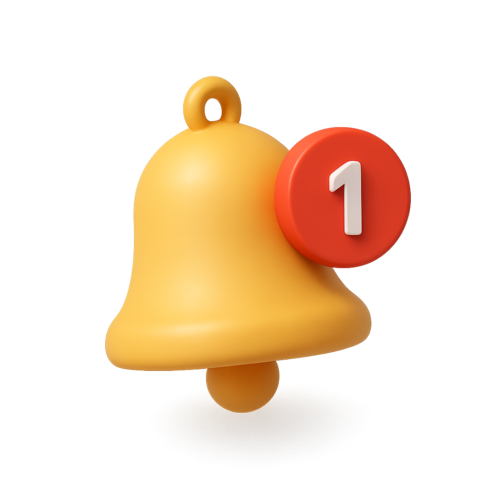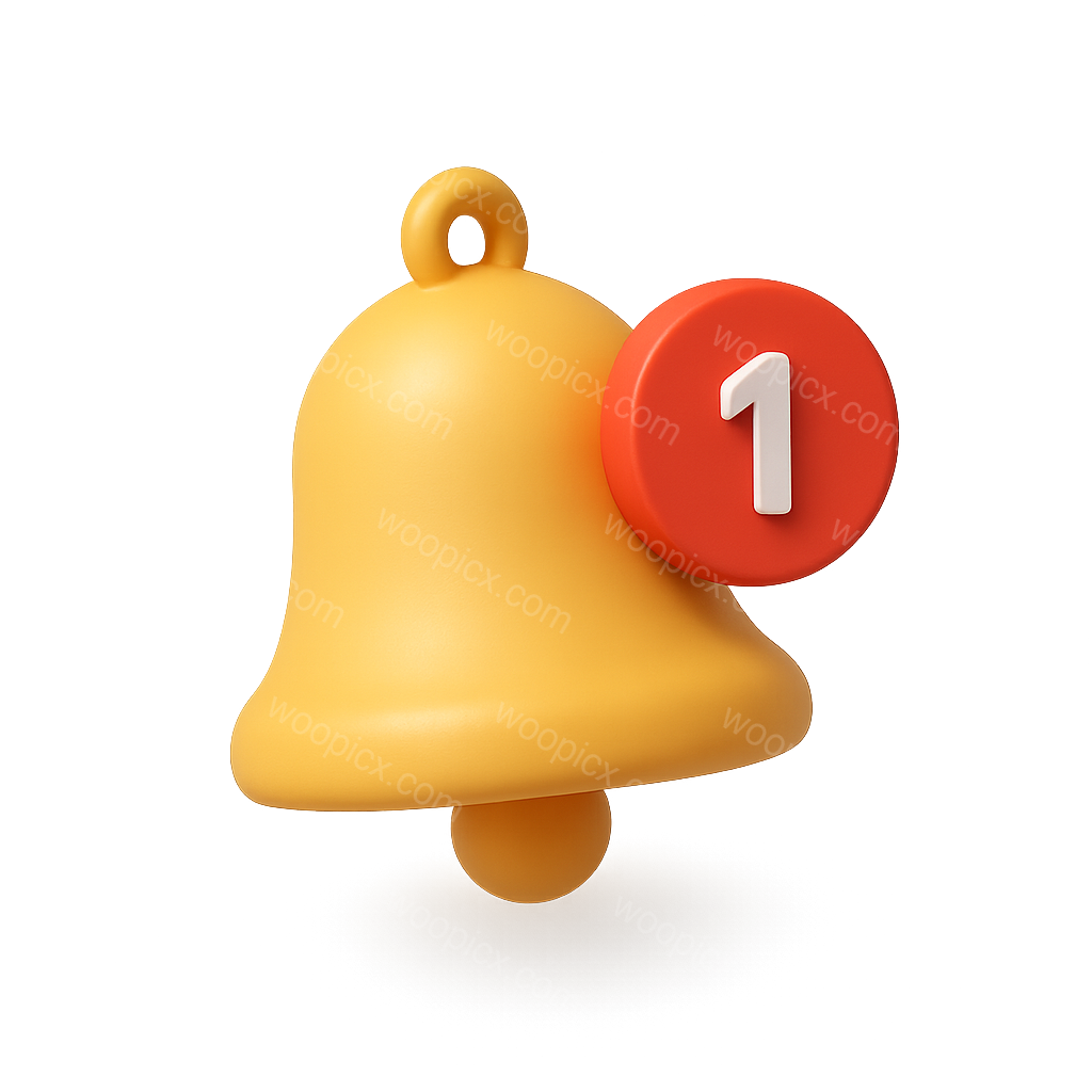 A glossy 3D bell icon in yellow with a red notification badge displaying the number one. The design features a three-quarter view, enhancing its volumetric appearance.