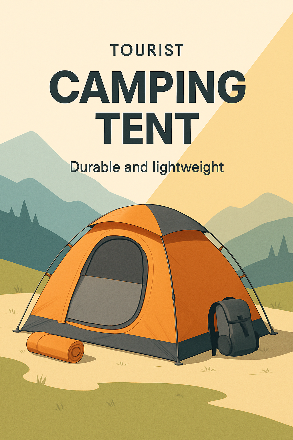 /Collection: /by davooda/Type: PNG/An eye-catching advertisement showcasing a durable and lightweight camping tent set against a serene mountain backdrop. The design features contrasting light colors for dynamism, emphasizing the tent's appeal.