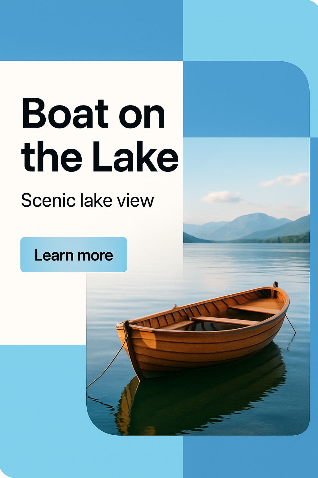 /Collection: /by davooda/Type: PNG/A well-lit, realistic image of a wooden boat on a serene lake. The background features bright geometric shapes and bold typography, creating a modern, professional look.