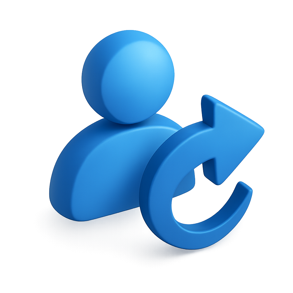 /Collection: /by davooda/Type: PNG/This image features a sleek 3D icon of a user silhouette with a returning arrow, designed in a vibrant blue shade. The icon has a transparent background and showcases a three-quarter view for a dynamic, isometric effect.