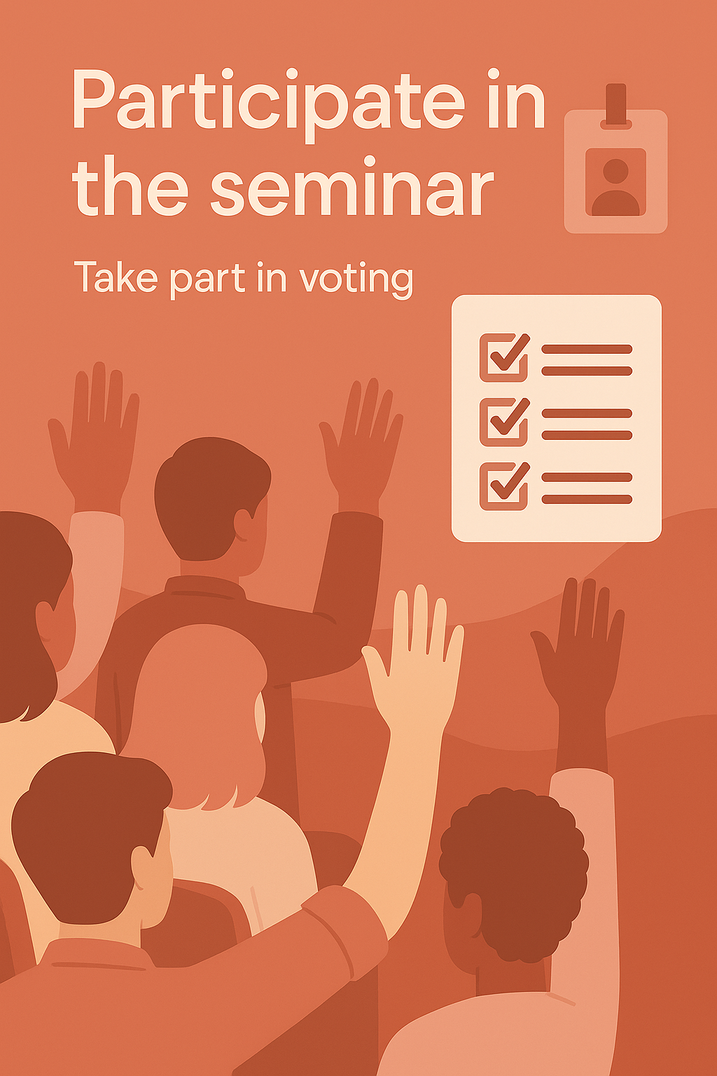 /Collection: /by davooda/Type: PNG/Illustrative graphic promoting seminar participation and voting, featuring diverse attendees raising hands with a checklist, designed for educational or event marketing.