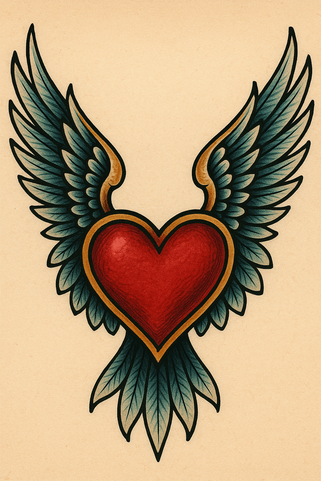 This image features a stylized heart with wings, combining vibrant colors and intricate details. Ideal for tattoos, artwork, or love-themed designs.