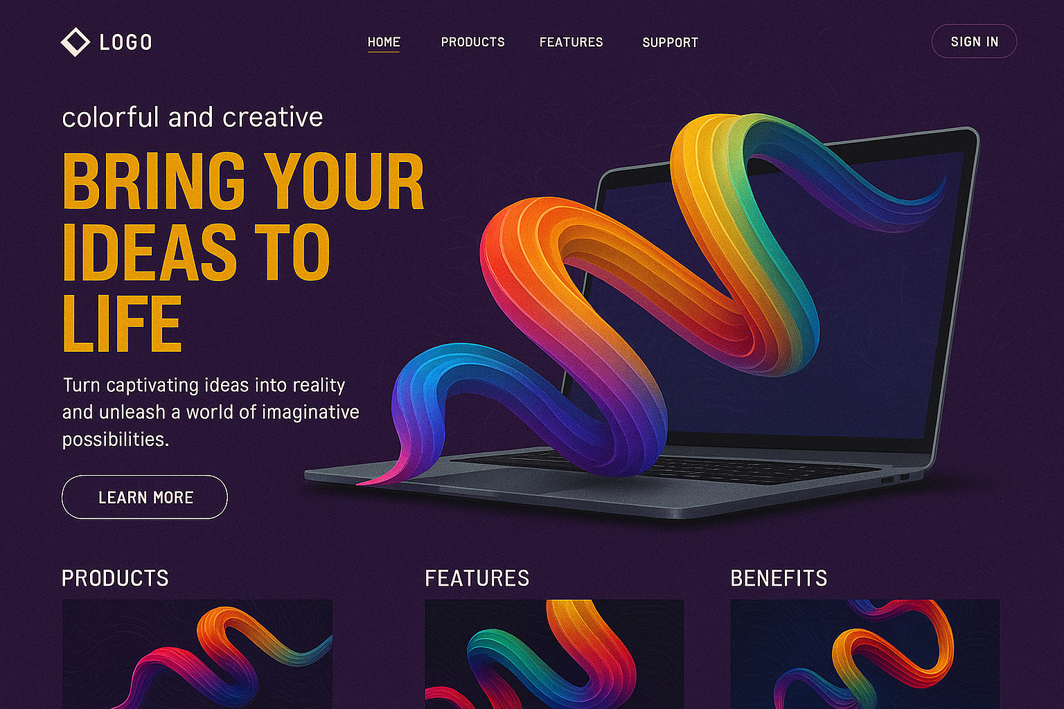 A vibrant landing page design featuring a laptop with colorful wave graphics emerging, alongside bold typography and structured sections for products and features.