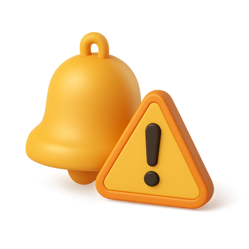 A vibrant 3D icon featuring a yellow bell and a warning sign in a three-quarter view. The transparent background enhances the volumetric appearance of the objects.