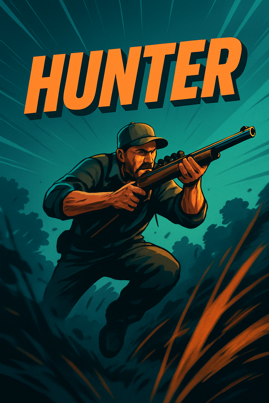 A striking illustration of a hunter in mid-action, poised with a rifle. The background features dynamic lines radiating outward, enhancing the sense of movement.
