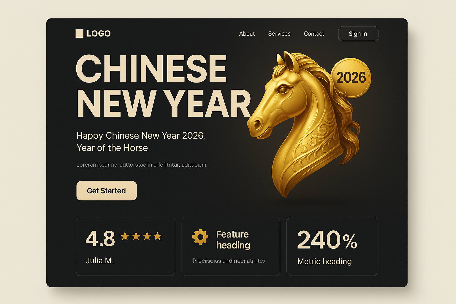 /Collection: /by davooda/Type: PNG/A sleek, modern landing page design featuring a golden horse for Chinese New Year 2026. The layout includes a bold headline, action button, and minimal text elements, creating a dramatic and balanced visual.