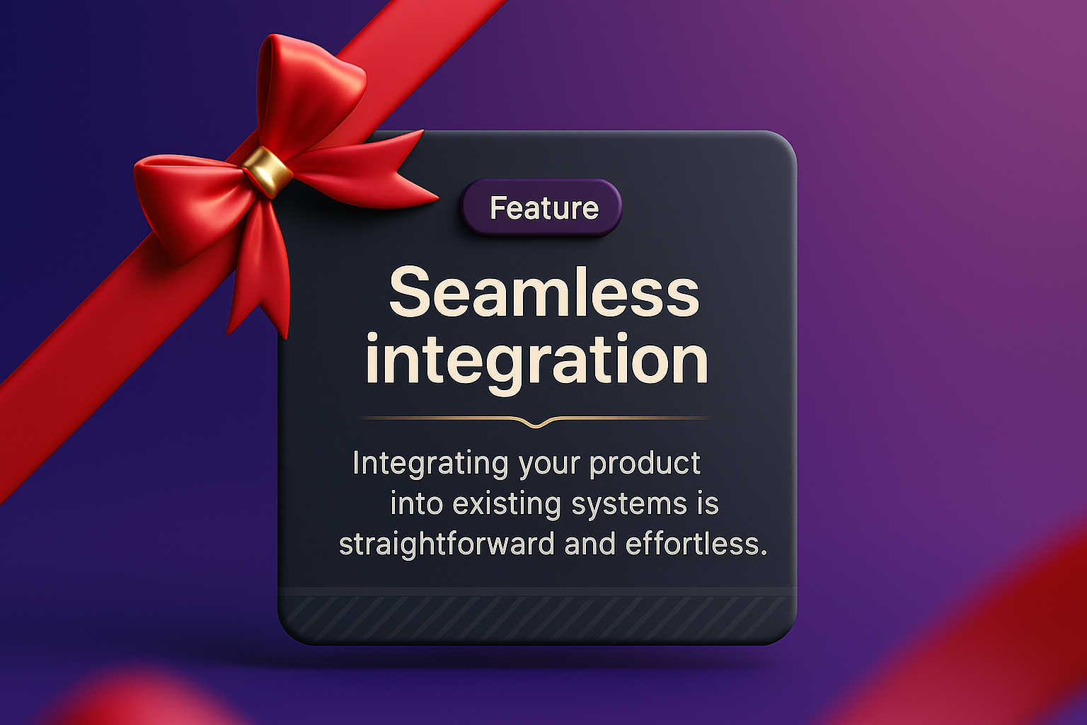 /Collection: /by davooda/Type: PNG/A striking red ribbon with a bow enhances a feature block displaying the text 'Seamless integration'. The design features a smooth gradient background, promoting a modern and cohesive look.