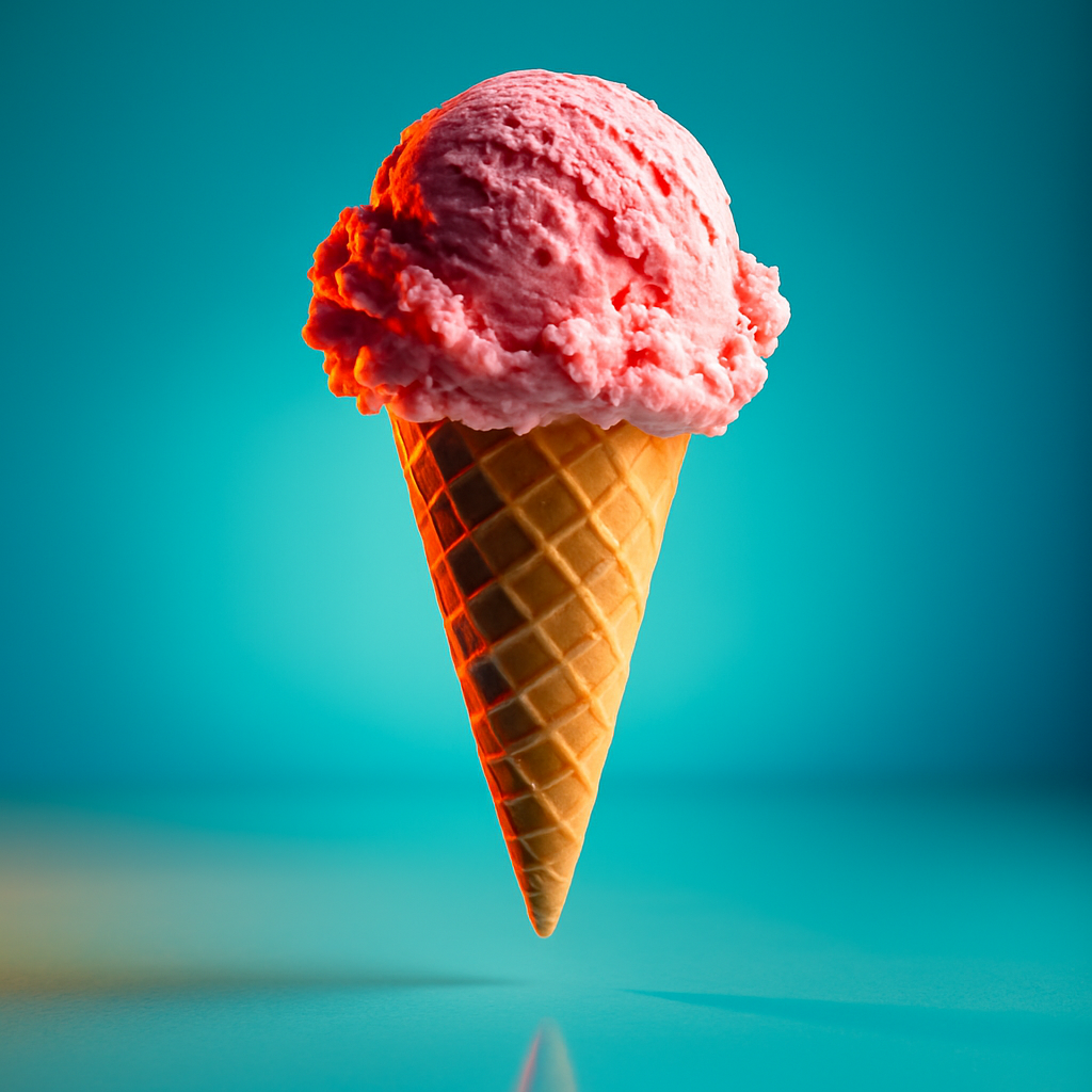 A vibrant depiction of an ice cream cone with a pink scoop, captured in mid-air against a smooth gradient background, emphasizing realism and dynamic lighting.