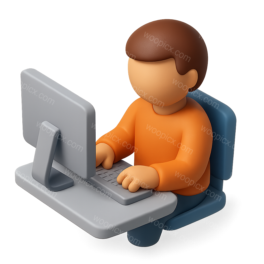 A stylized 3D isometric icon featuring a person seated at a computer, depicted in a three-quarter view. The character is shown in an orange shirt with a modern chair and desk setup.