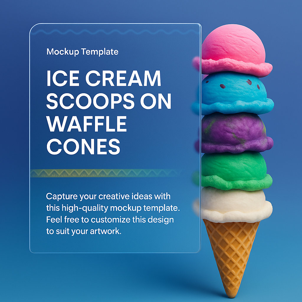 A vibrant mockup of multiple ice cream scoops in a waffle cone, set against a smooth gradient background. The design features a transparent overlay for text and graphics.