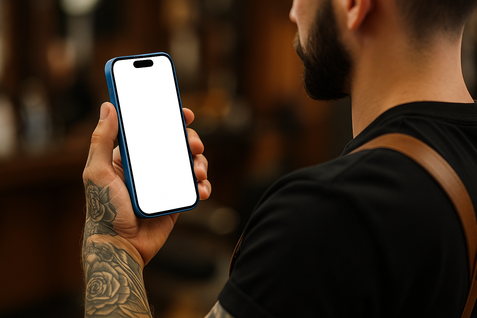 A tattooed barber is holding a blue phone vertically, showcasing a blank screen. The image is captured from behind the barber, emphasizing a dynamic perspective.