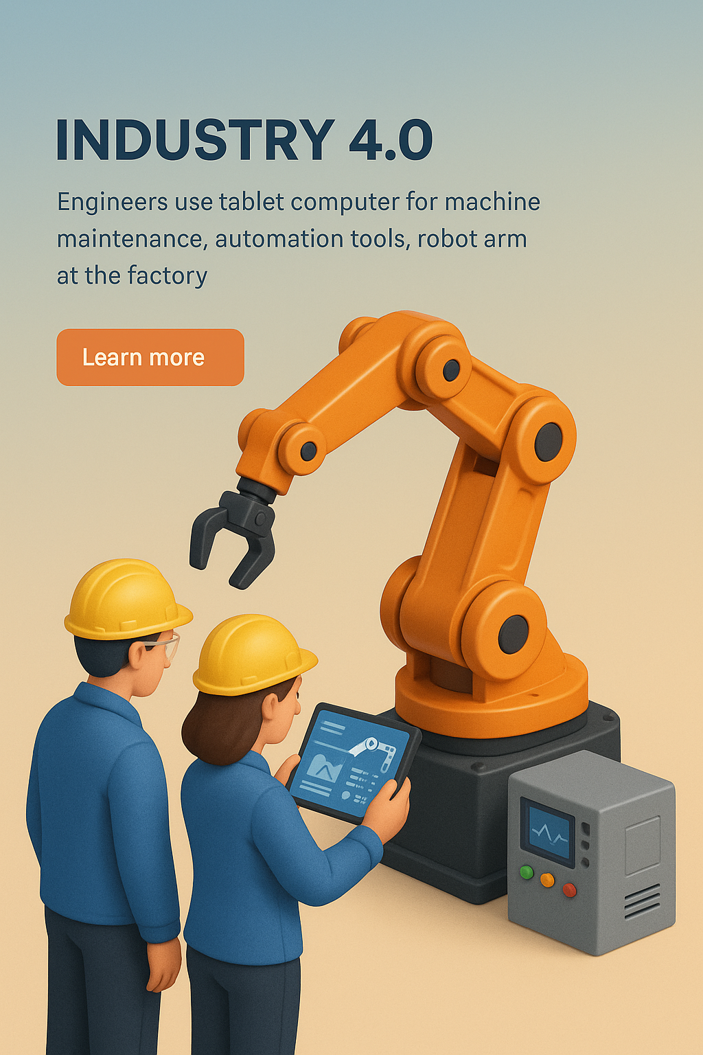 /Collection: /by davooda/Type: PNG/A detailed 3D illustration of engineers using a tablet for machine maintenance alongside a robotic arm in an industrial setting. The design features a gradient background and clear text elements.