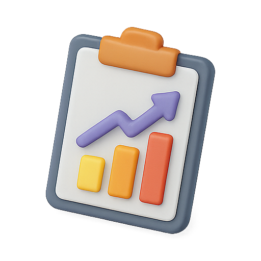 Stylized 3D icon representing a clipboard with a growth chart, featuring colorful bars and an upward arrow. Ideal for use in analytics, business presentations, or data visualization.