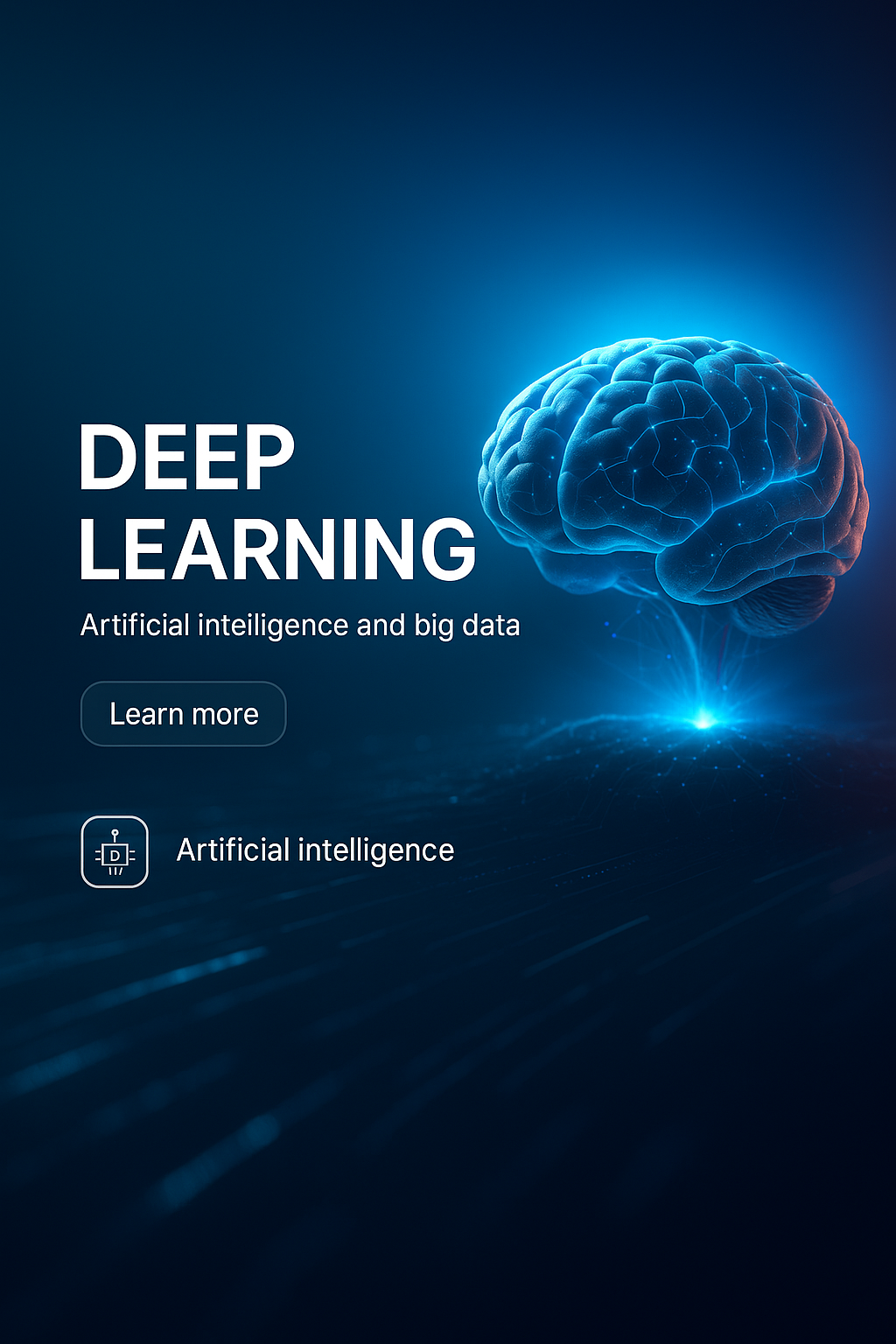 /Collection: /by davooda/Type: PNG/This digital graphic showcases a futuristic brain illuminated in blue, representing deep learning and artificial intelligence. Ideal for tech-related content.
