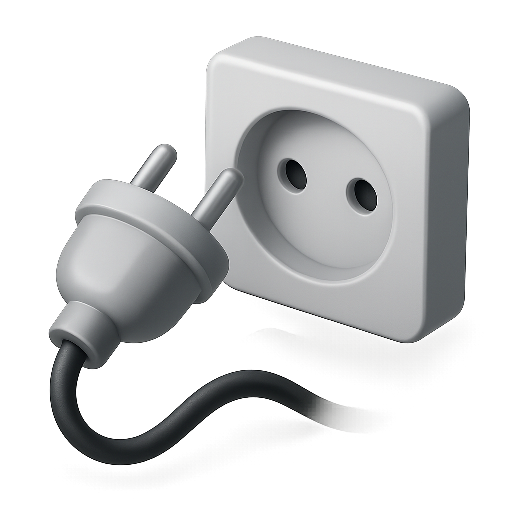 This image features a 3D icon of an electric plug and socket, designed in a three-quarter view with a volumetric effect. The plug is gray, connected to a black wire, and the socket has two circular openings.