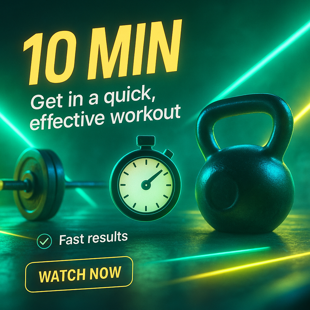 /Collection: /by davooda/Type: PNG/A vibrant neon-themed ad showcasing a 10-minute workout. The design features a stopwatch, kettlebell, and barbell with glowing accents, promoting quick and effective fitness results.