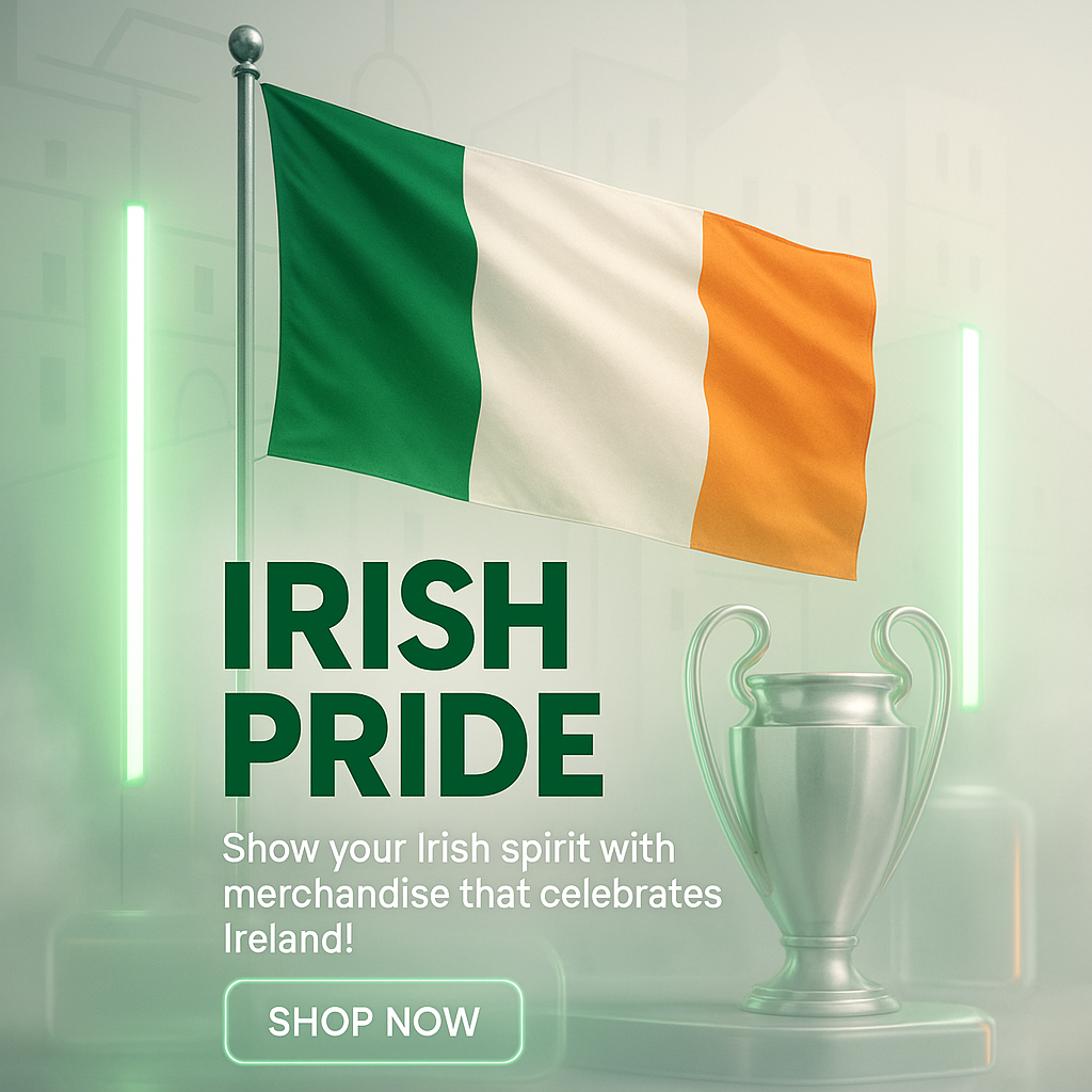 Promotional Image for Irish Merchandise Featuring Flag and Trophy