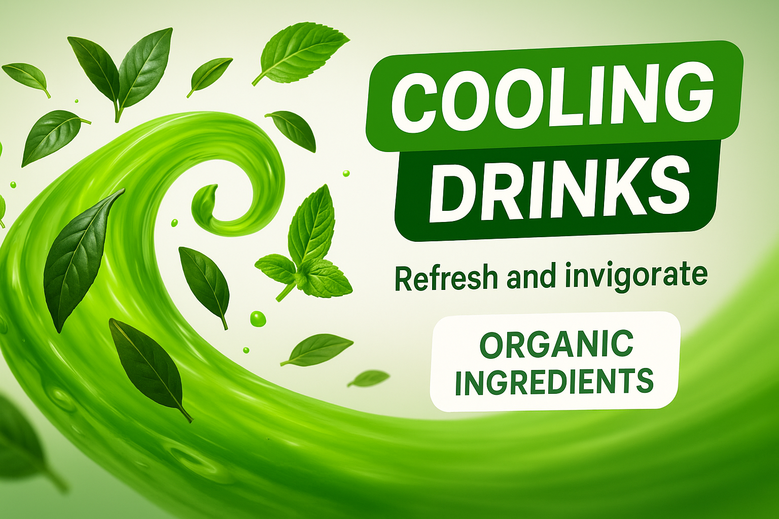 /Collection: /by davooda/Type: PNG/A visually appealing promotional graphic featuring a refreshing theme, ideal for marketing organic cooling drinks. The design incorporates green hues and leaf motifs, emphasizing natural ingredients.