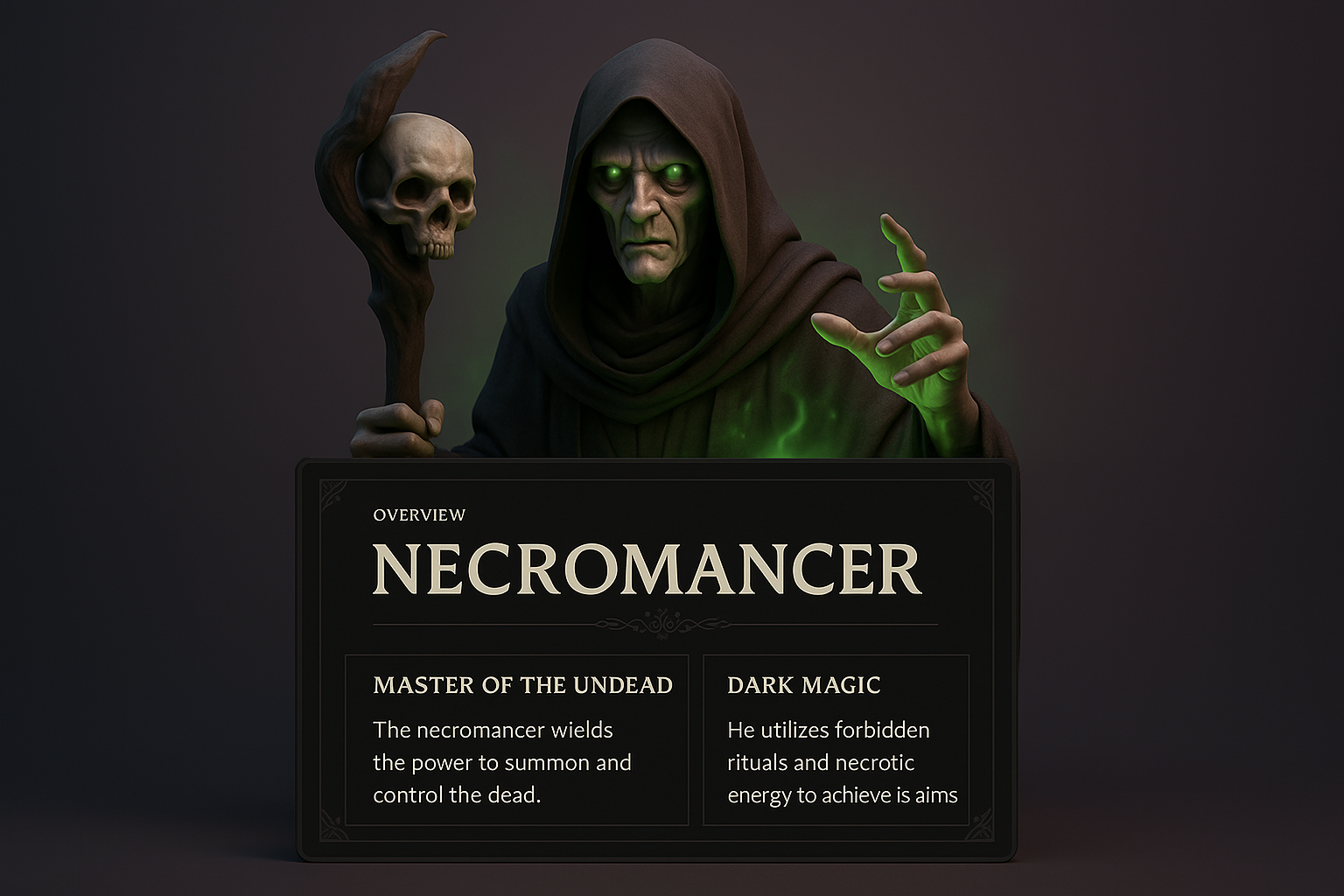 /Collection: /by davooda/Type: PNG/A detailed 3D illustration of a necromancer holding a skull, with glowing green elements. The image integrates dark informational blocks with titles and descriptions, enhancing the mystical theme.