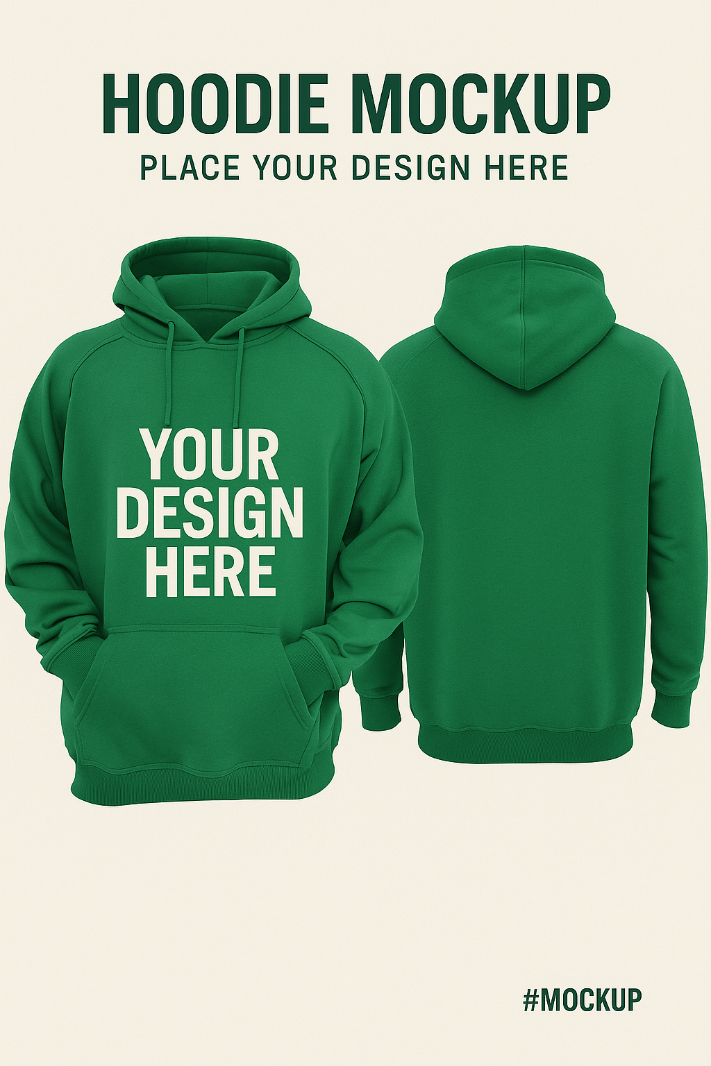 Realistic hoodie mockup featuring a green hoodie with customizable design areas, ideal for apparel branding and design presentations.