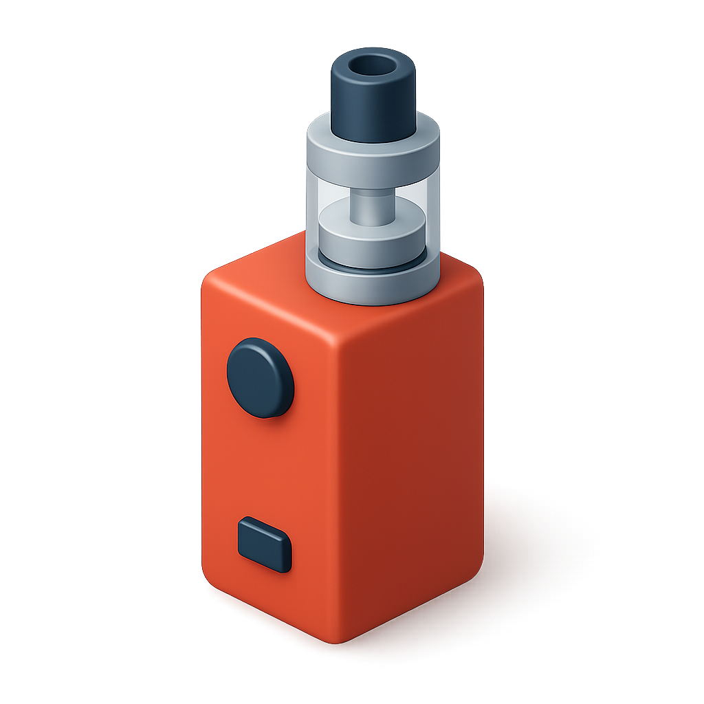 A vibrant 3D icon of a vaping device rendered in a three-quarter isometric view. The design features a transparent tank atop a solid-colored body, accentuated with buttons.