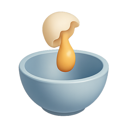 A simple and clean illustration depicting a cracked egg shell with yolk dropping into a light blue bowl, ideal for culinary or cooking-related content.