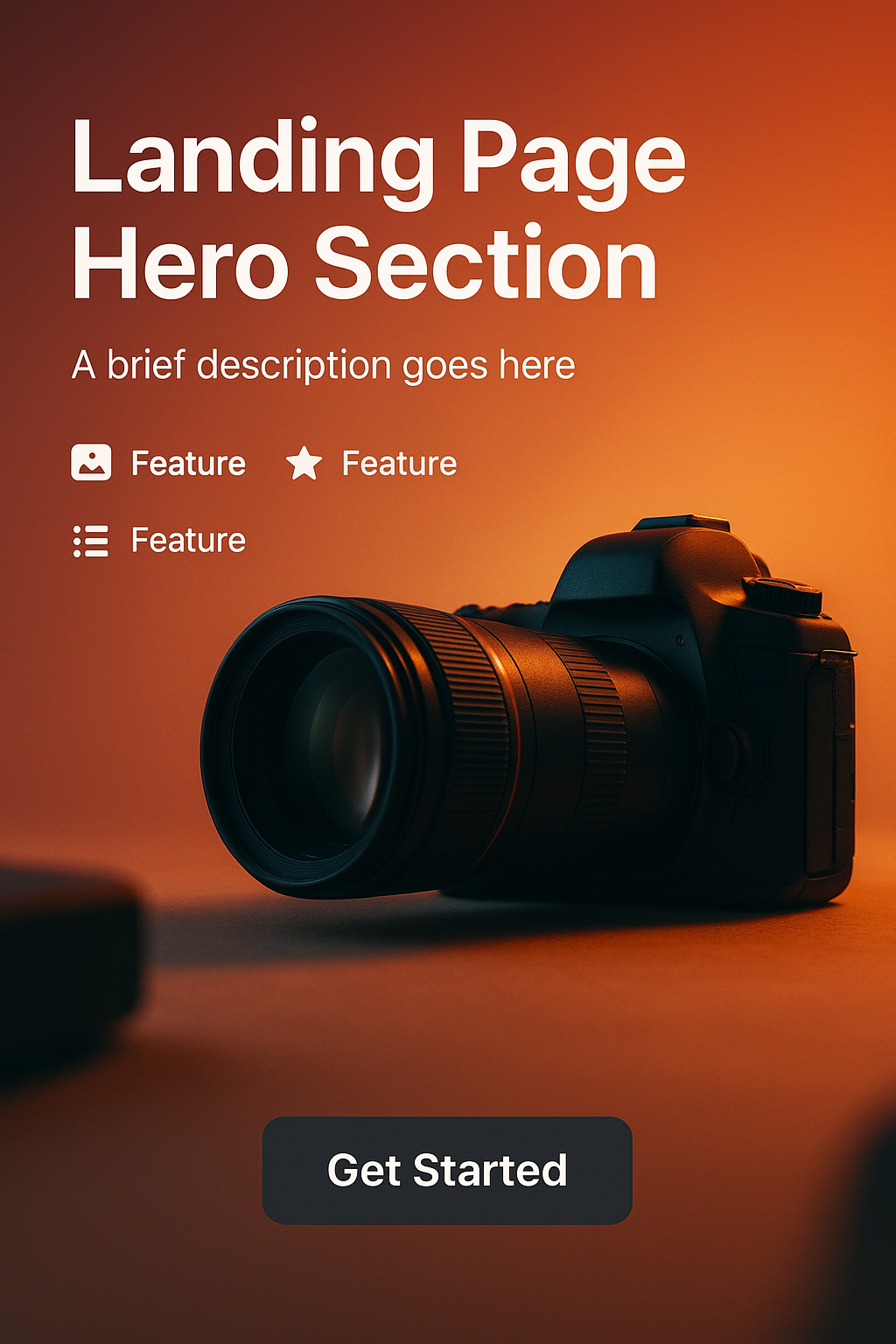 /Collection: /by davooda/Type: PNG/This is a digital mockup of a landing page hero section showcasing a camera. The design features a warm color palette and is intended for marketing photography services.