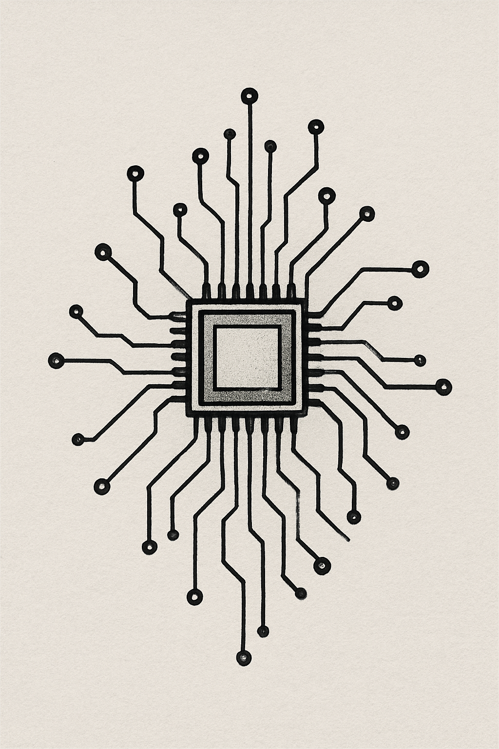 /Collection: /by davooda/Type: PNG/This image features a stylized illustration of a microchip with emanating circuit lines, showcasing a tech-inspired design. Ideal for technology blogs or digital art projects.