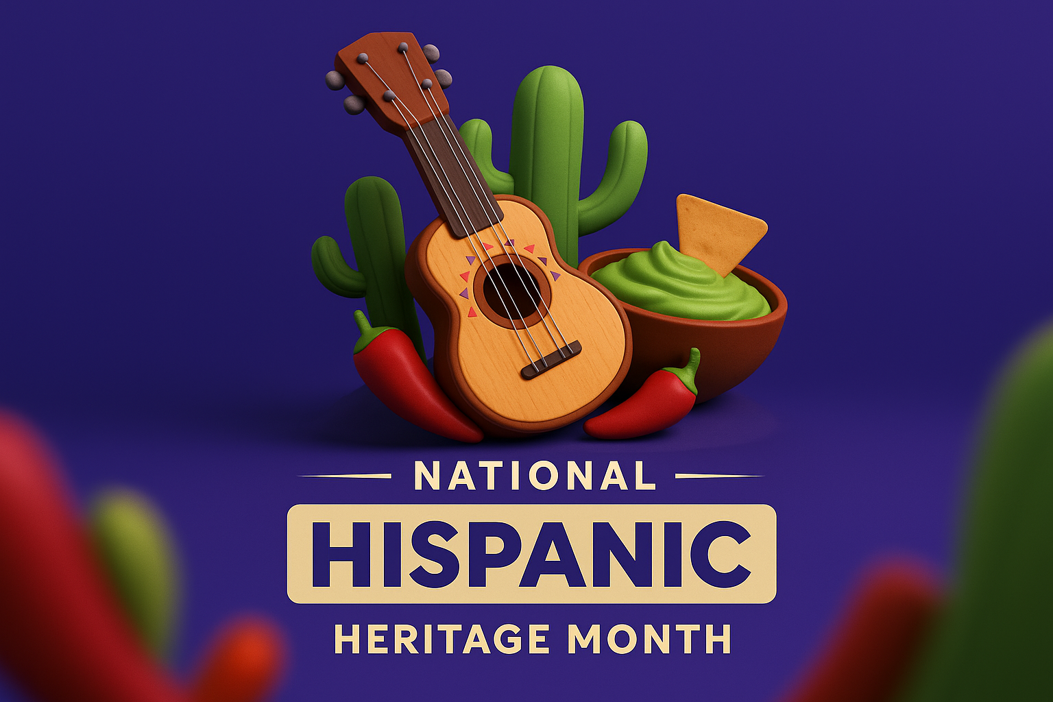 A colorful 3D illustration featuring a guitar, guacamole, and cacti to celebrate National Hispanic Heritage Month, set against a rich purple background.