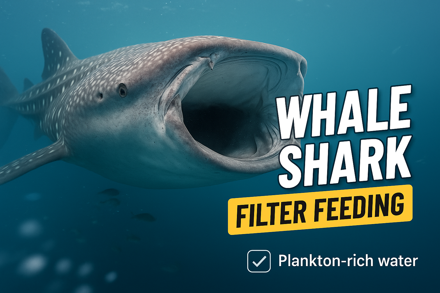 /Collection: /by davooda/Type: PNG/Vibrant underwater image of a whale shark in filter feeding mode, featuring informative text overlay. Ideal for educational content about marine life and biodiversity.