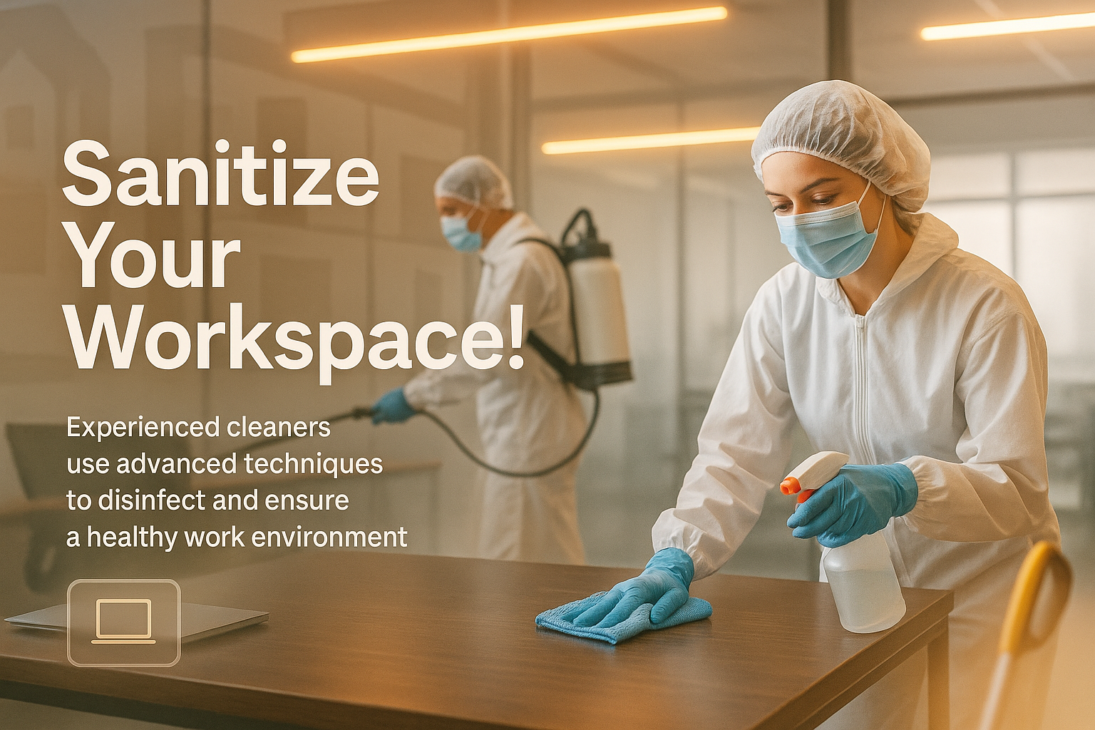 Informative graphic depicting professional cleaners sanitizing a workspace, emphasizing hygiene and safety. Ideal for health and safety campaigns.