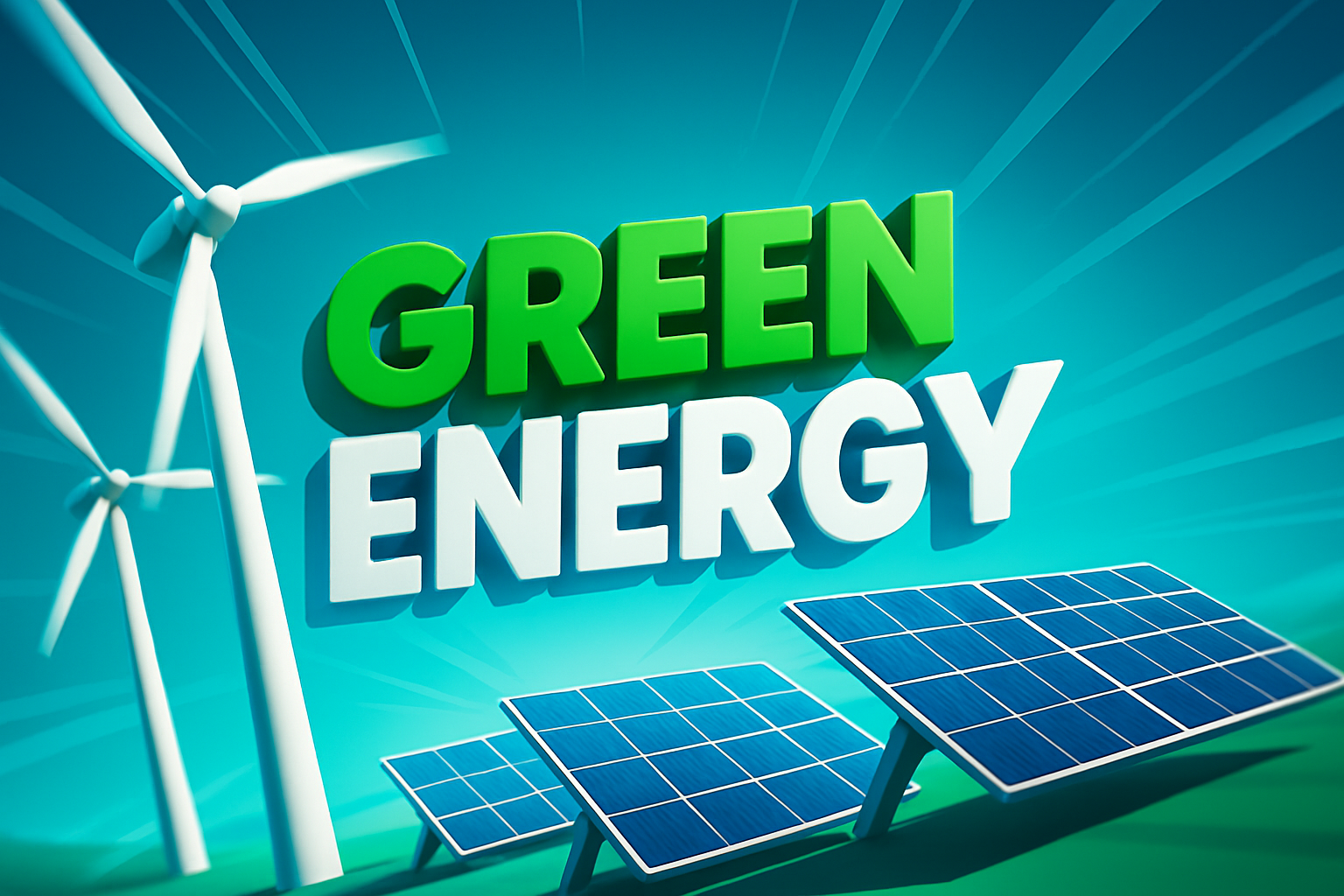 /Collection: /by davooda/Type: PNG/A vibrant and dynamic illustration showcasing wind turbines and solar panels, emphasizing green energy. The scene features a smooth gradient background with energetic lines radiating outward.