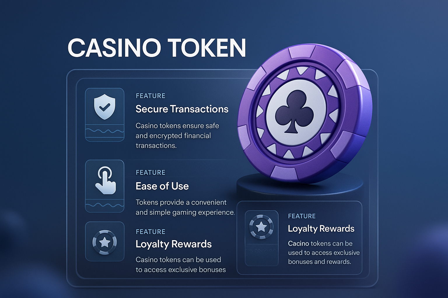 A visually striking 3D illustration of a casino token with highlighted features such as secure transactions, ease of use, and loyalty rewards, set against a smooth gradient background.