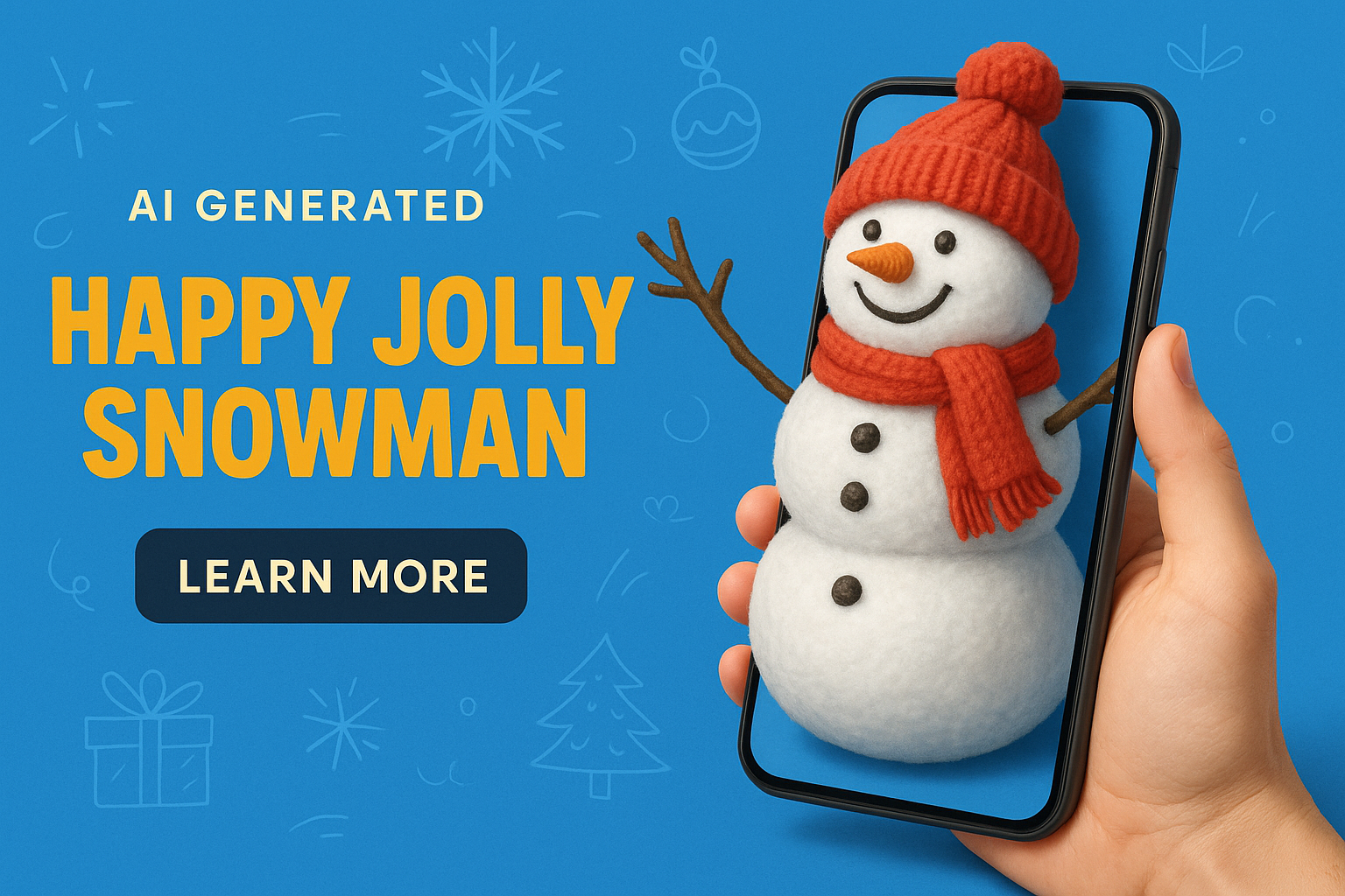A cheerful snowman with a red hat and scarf emerges from a smartphone on a blue background, complemented by bold typography and a modern design.