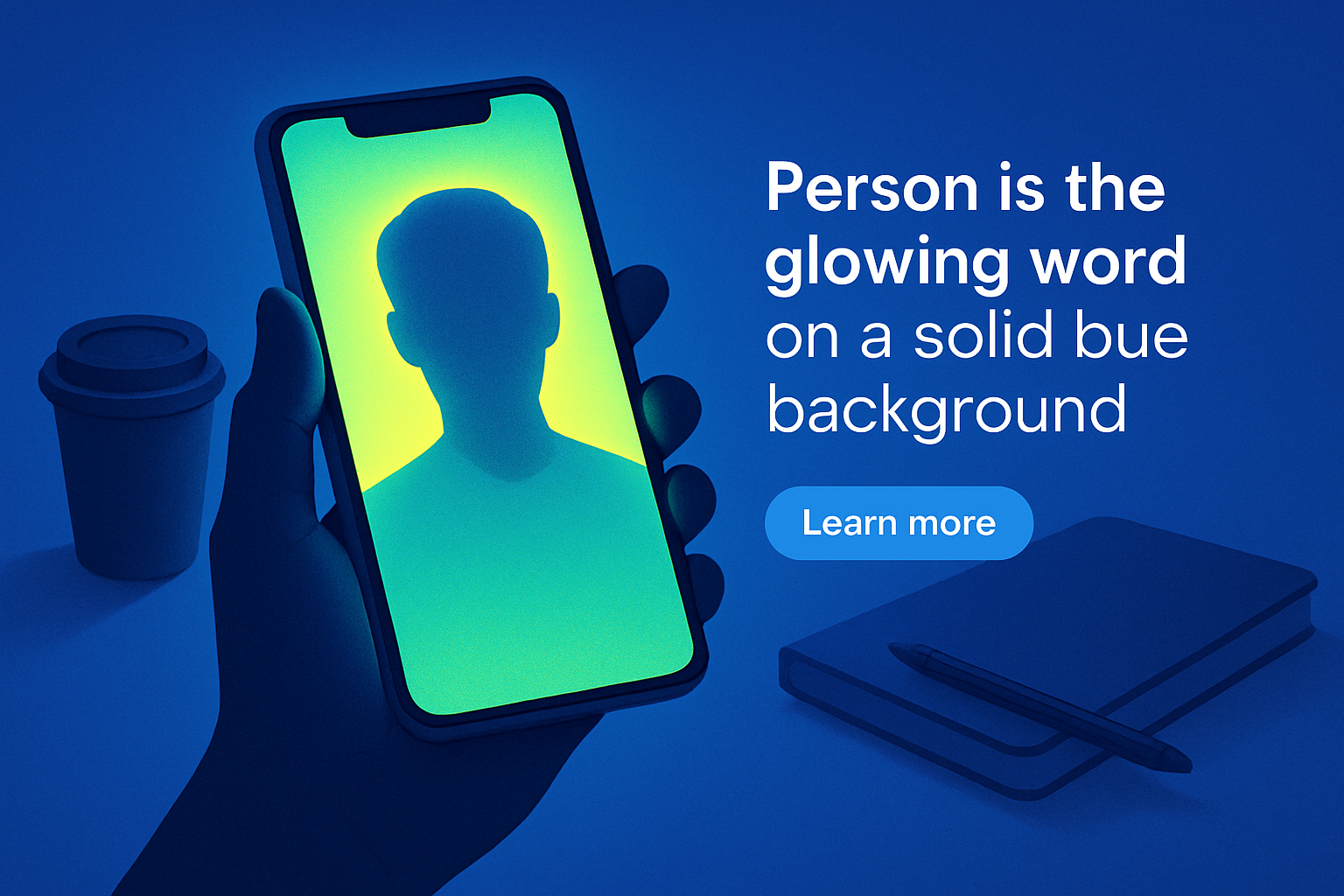 /Collection: /by davooda/Type: PNG/A hand holding a phone displaying a glowing silhouette against a solid blue background. The glow transitions from light yellow-green to blue, creating an atmospheric effect.
