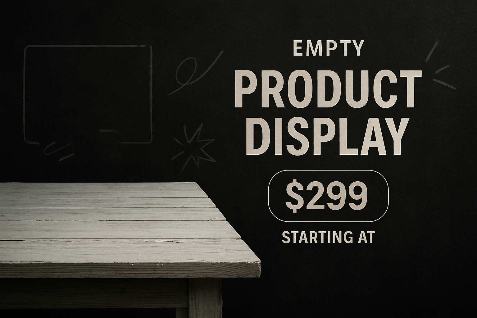A sleek and modern product display featuring an empty wooden white table against a textured white wall. Bold typography highlights the product's price and details, creating an energetic advertisement.