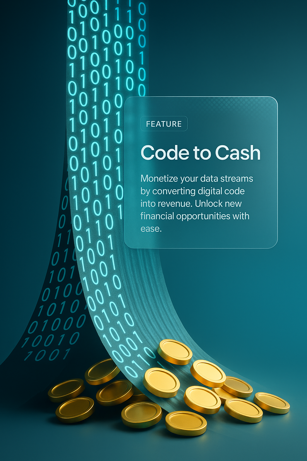 /Collection: /by davooda/Type: PNG/A visually striking image depicting binary code cascading down and transforming into shiny coins, illustrating the concept of monetizing digital data. The design features a transparent panel with text highlighting financial opportunities.