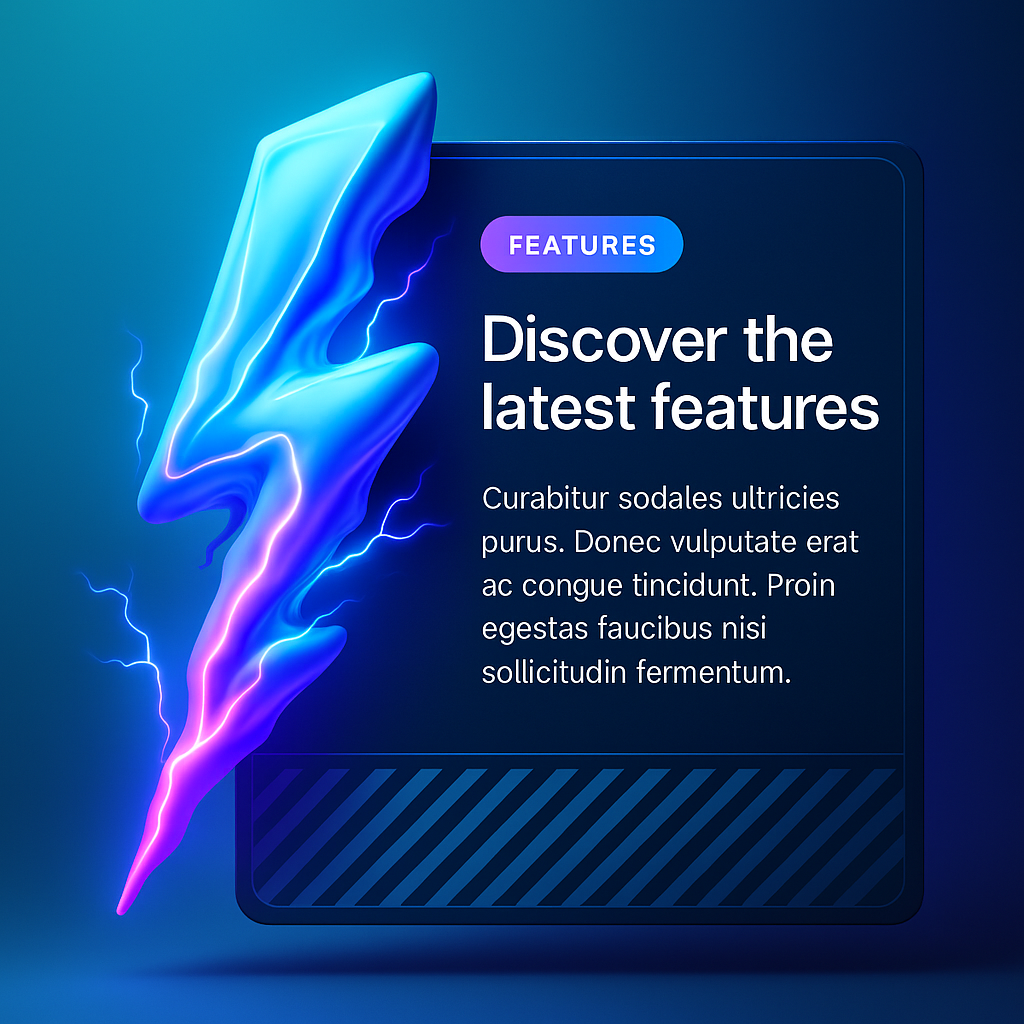 A dynamic 3D rendering of a lightning strike in vibrant colors, integrated with a features block. The design combines smooth gradients and a modern layout.