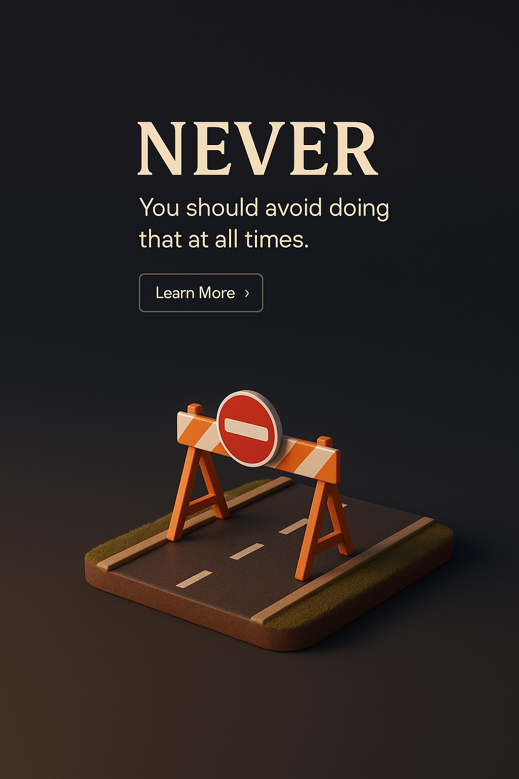 /Collection: /by davooda/Type: PNG/A visually appealing 3D scene featuring a caution sign on a road, designed with a dark gradient background. Text elements include a bold title and informative message, creating a cohesive layout.