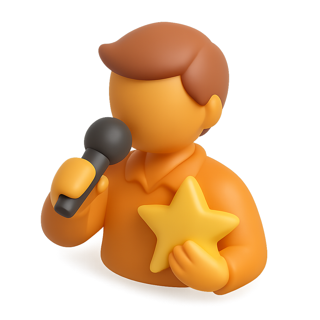 /Collection: /by davooda/Type: PNG/A vibrant 3D icon featuring a figure holding a microphone and a star, presented in a three-quarter isometric view with a smooth, volumetric design on a transparent background.