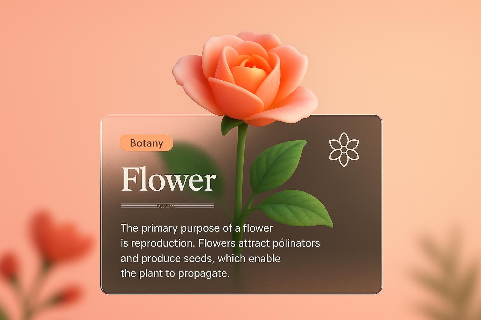 A visually striking 3D illustration of a flower with an integrated informational panel. The panel features a title, decorative elements, and descriptive text, set against a soft gradient background.